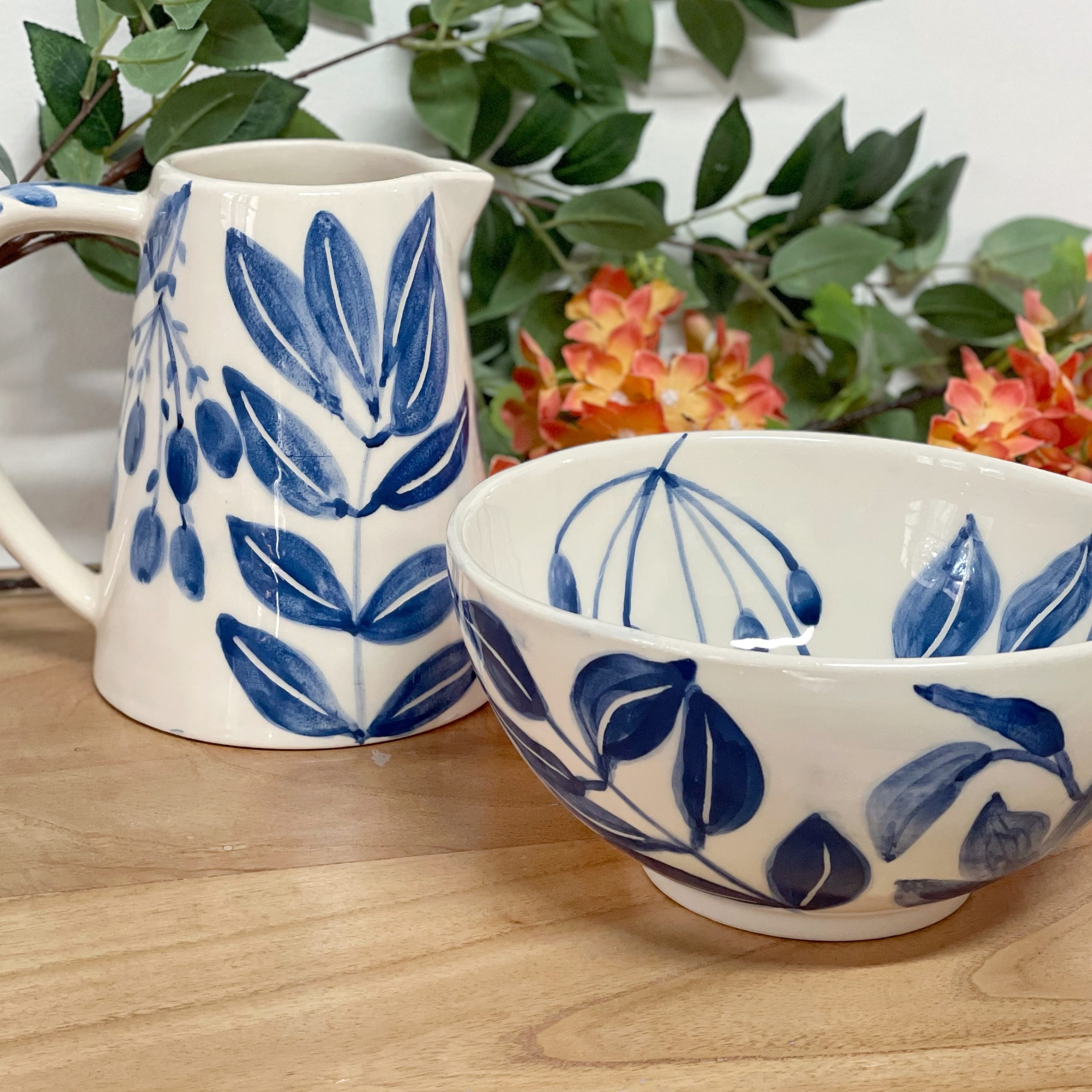 Este conjunto combina la calidez del fondo natural de la cerámica con la frescura de una decoración floral en tono azul. Cada pieza está ilustrada a mano con flores y hojas en azules logrando una estética serena y elegante. Ideal para realzar cualquier mesa con un toque de arte y sutileza.